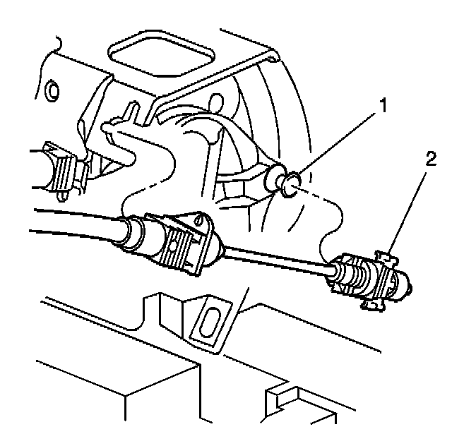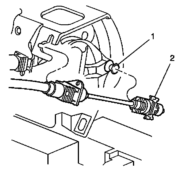 2. Hold the throttle cam open, slide the cruise cable fitting (2) off of the pin (1) on the throttle cam by pushing the cable fitting towards the throttle close direction.