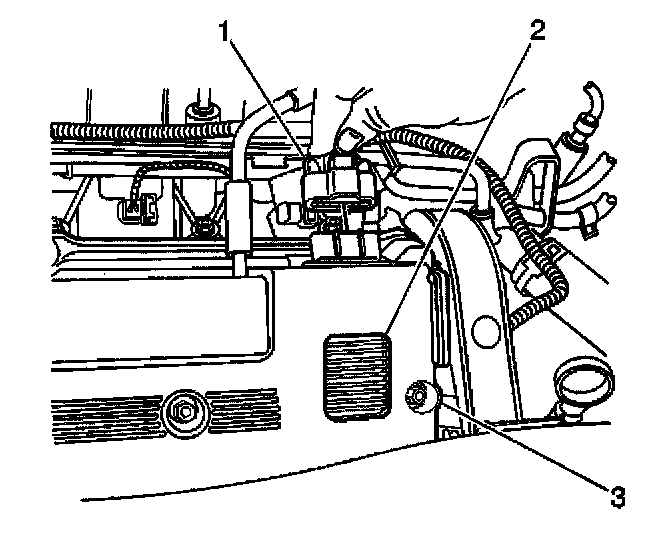 13. Remove the 4 bolts (1) attaching the fuel rail (2) to the intake manifold (3).
