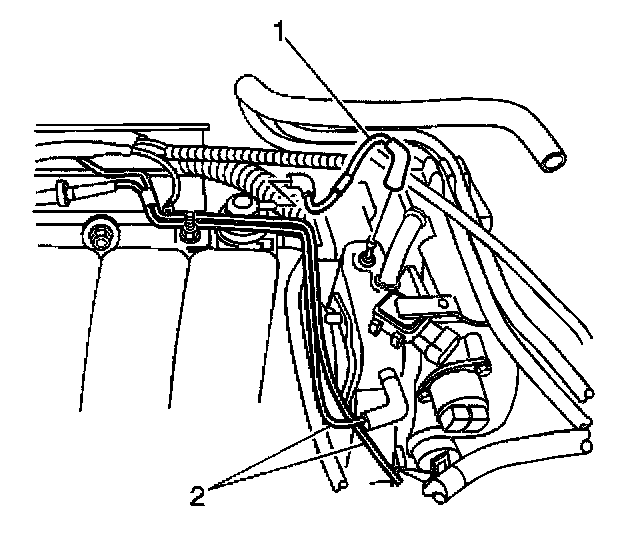 11. Carefully position aside the surge tank pipe (2) from the fuel rail studs.