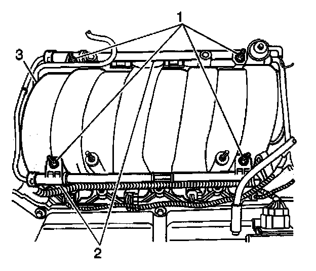 10. Install the 4 bolts (1) attaching the fuel rail (2) to the intake manifold (3).