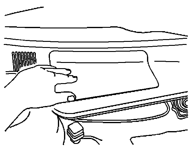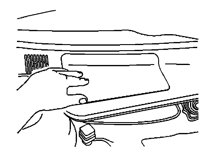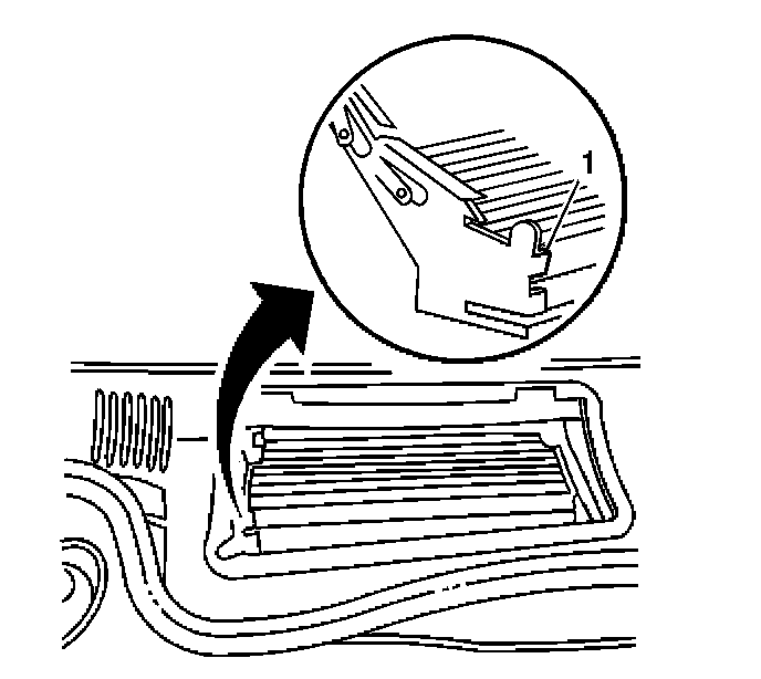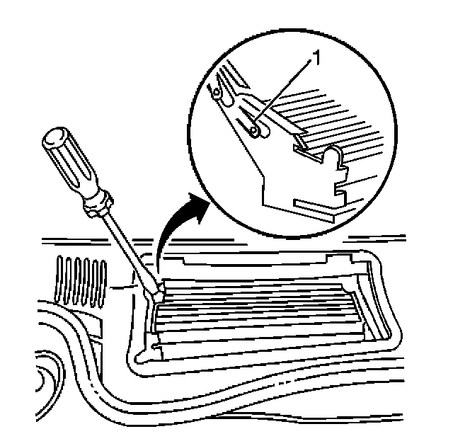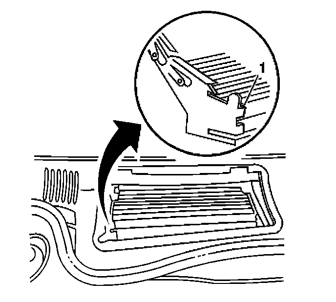 4. Using a flat bladed tool, release the retainer tab (1) on the passenger side of the HVAC filter and housing by inserting the tool between the air filter and the compartment wall on the outboard side of the vehicle.
