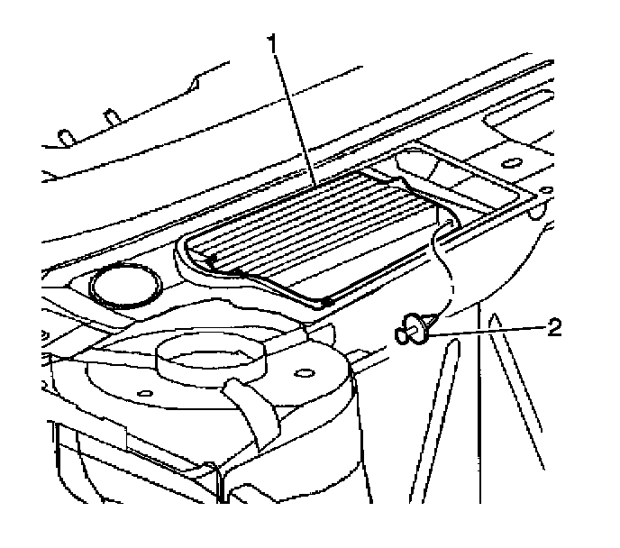 3. Install the push pin retainer (2) into the forward corner of the HVAC filter housing (1).