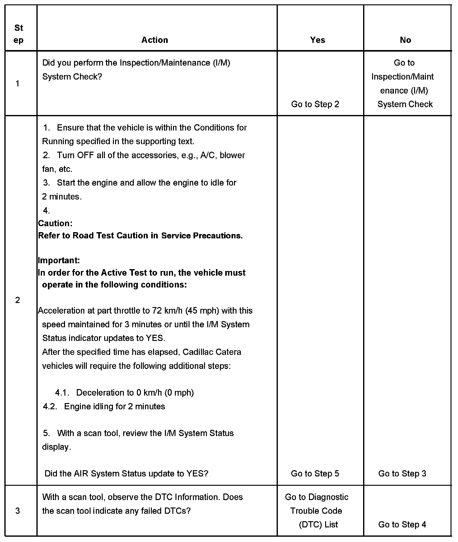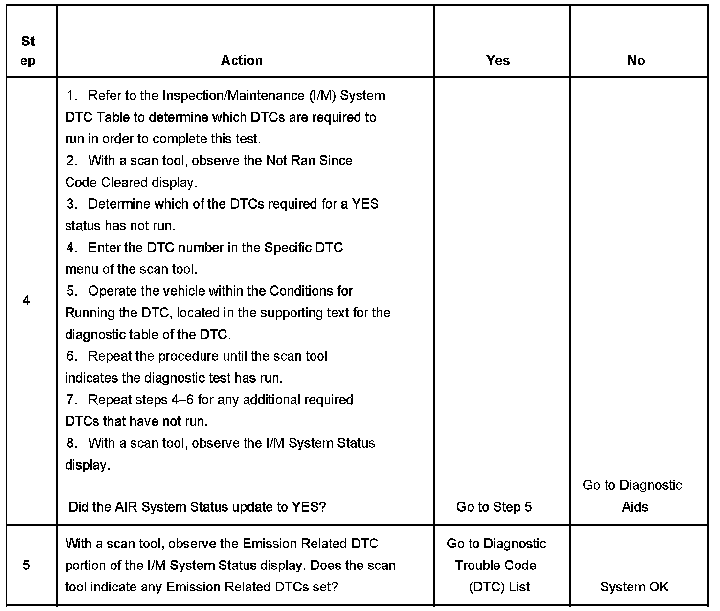 3. This step identifies a first failure of a type B DTC. A DTC only appears on the I/M System Status display when the DTC becomes a MIL illuminating DTC. This occurs on the second failure of a type B DTC. A first failure of a type B DTC will not allow the I/M System Status to update to YES. Refer to Diagnostic Aids.