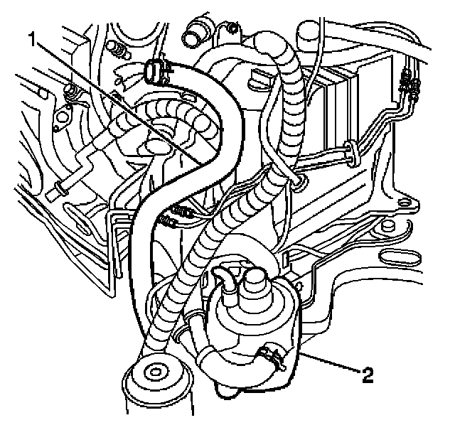 3. Lower the splash shield far enough to gain access to the secondary air injection (AIR) pump (2) assembly.