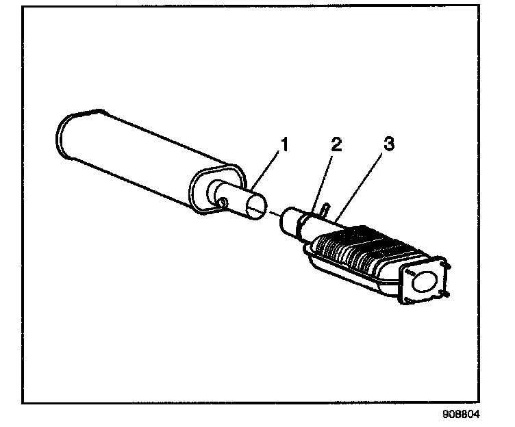9. Cut the catalylic converter (3) from the resonator inlet pipe (1) behind the step 2 but as close to the step as the tool will permit. The replacement catalytic converter will slide over the inlet pipe.