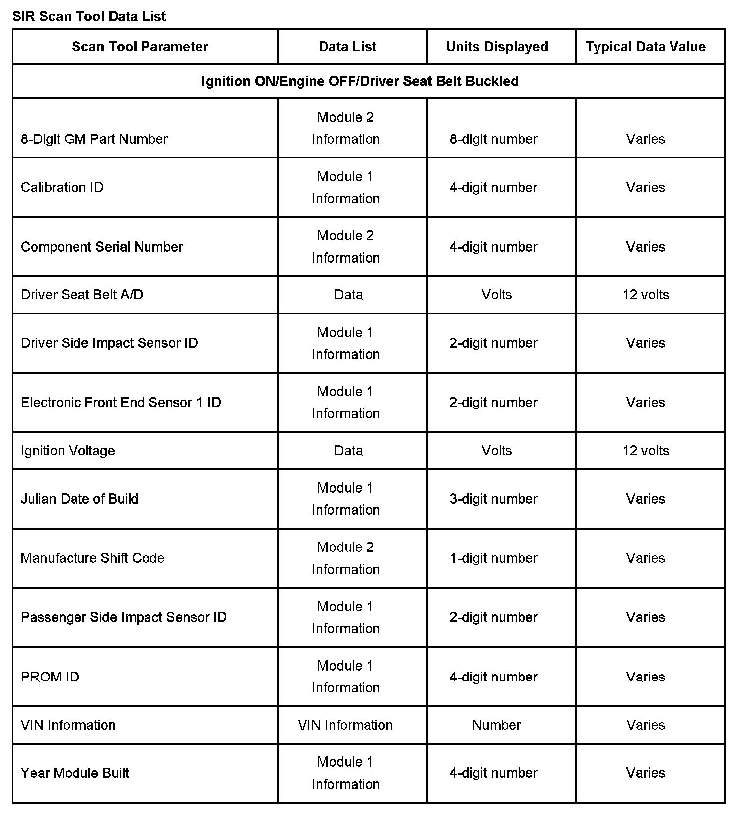 The SIR Scan Tool Data List contains all the restraint system related parameters that are available on the scan tool. The parameters in the list are arranged in alphabetical order. The column, "Data List," indicates the location of the parameter within the scan tool menu selections.