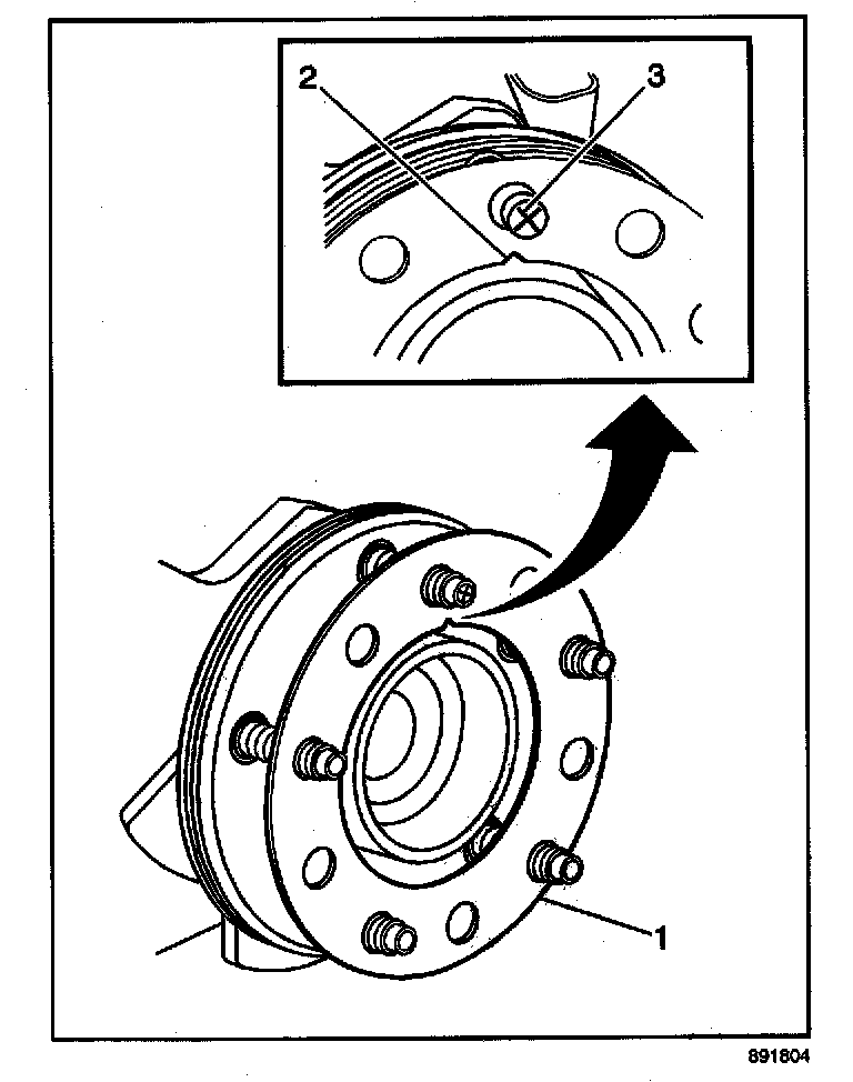 6. Install the correction plate (1) onto the hub/axle flange, with the V-shaped notch (2) orientated to align with the high spot mark (3), that was positioned to face upward.