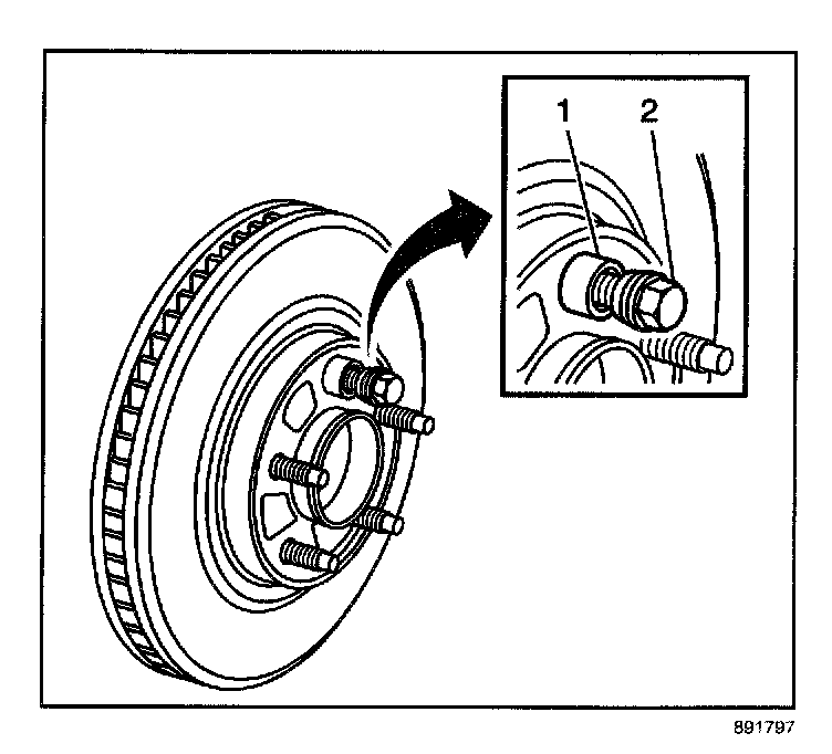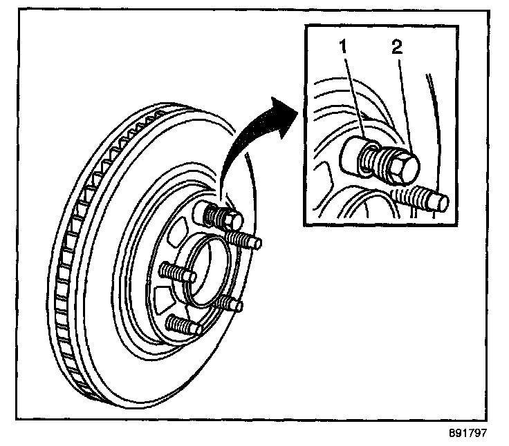8. Hold the rotor firmly in place against the hub/axle flange and install one of the J45101-100 (1) and one lug nut (2) onto the upper-most wheel stud.