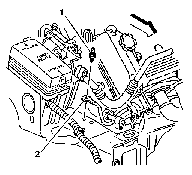 2. Remove the bolt (1) securing the engine ground cable (2) to the right side body frame rail.
