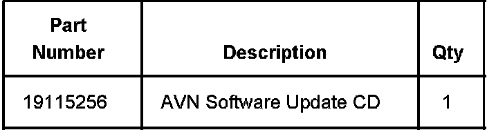 Technicians are to update the AVN system software using an update disc, P/N 19115256. To perform the update, follow the instructions given in the booklet that is included with the disc. Do not turn the ignition switch off during the software update.