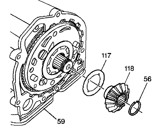 5. Remove the left side differential gear (118). Remove the thrust washer (117).