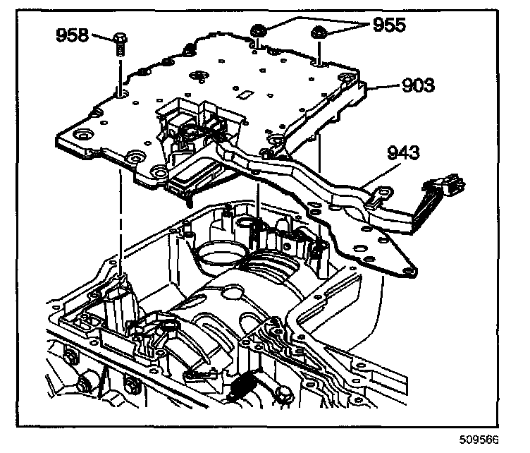 6. Hand start the bolts (534) to hold the oil transfer plate (956) in place with the lower control valve body wire harness retaining clips (943) attached properly.