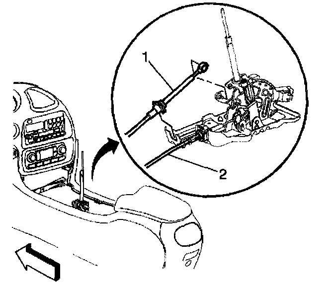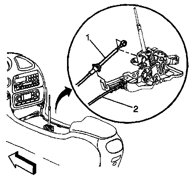 2. Slide the transaxle range selector cable (1) fully into the console until it snaps into place.