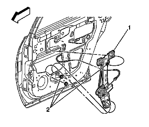 12. Remove the window regulator to inner door panel fasteners (2).