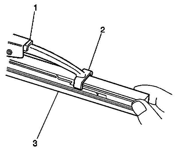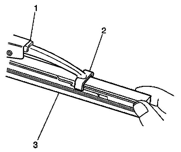 3. Engage the bottom claw (2) of the wiper blade (1) into the notches in wiper blade element (3).