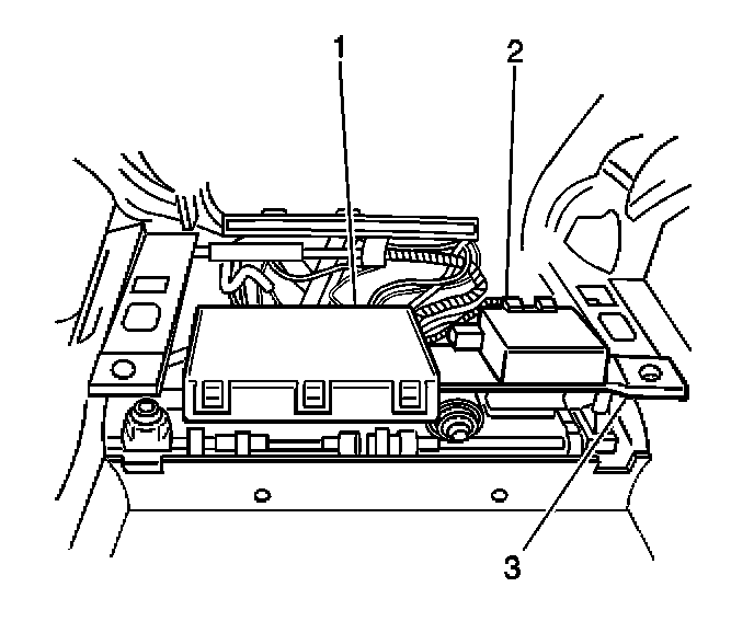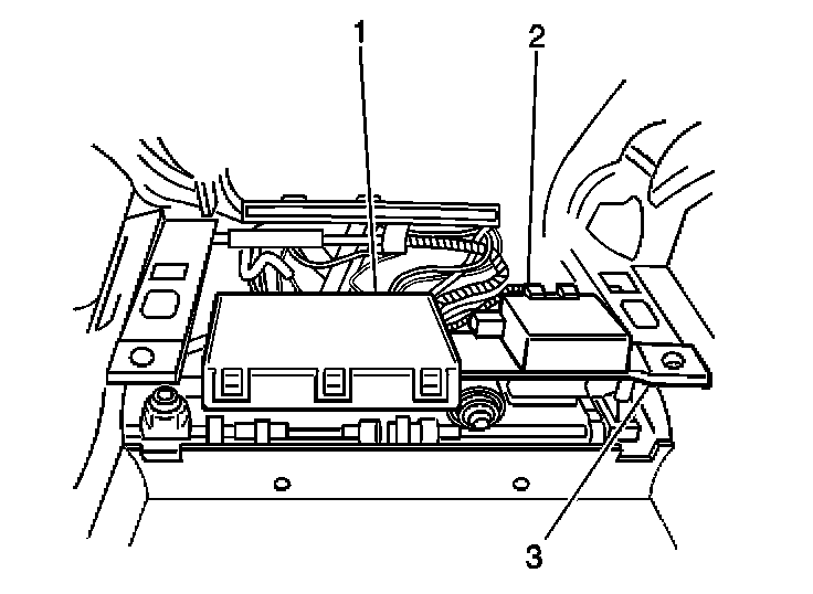 2. Install the module and bracket assembly (3) to the seat riser, with the electrical connections towards the rear of the vehicle.
