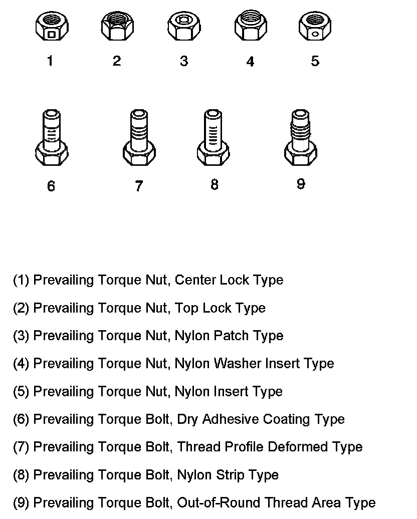 These fasteners accomplish the thread interface by the presence of a thread-locking compound on the fastener threads. Refer to the appropriate repair procedure in order to determine if the fastener may be reused and the applicable thread-locking compound to apply to the fastener.