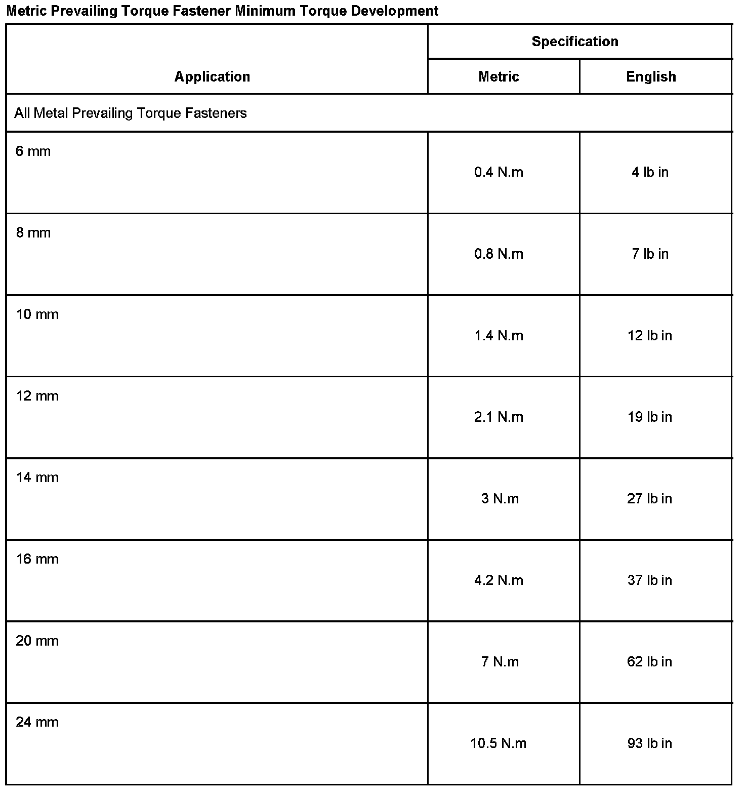 Metric Prevailing Torque Fastener Minimum Torque Development Part 1: