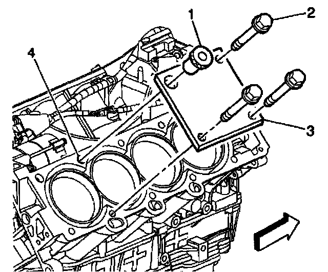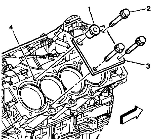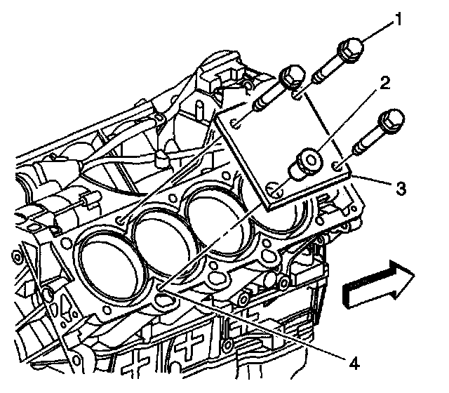 1. Position the fixture plate (3) with the bushing (1) installed over the cylinder head bolt hole to be repaired (4).