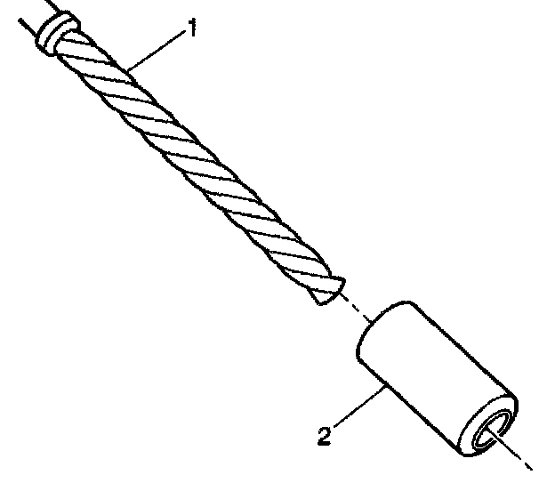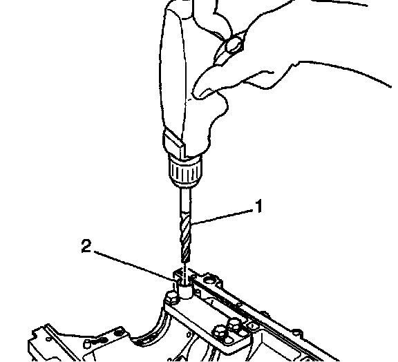 ^ Drill the crankshaft main bolt hole until the mark (1) on the drill aligns with the top of the d' ill bushing (2).
