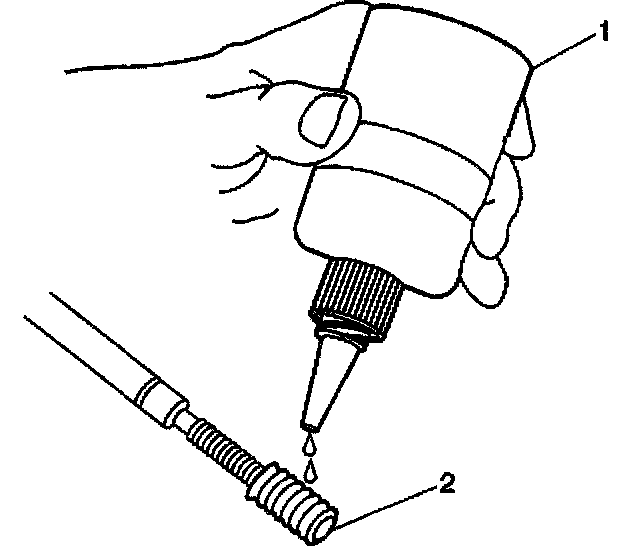 15. Lubricate the threads of the driver installation tool (2) with the driver oil (1) J 42385-110.
