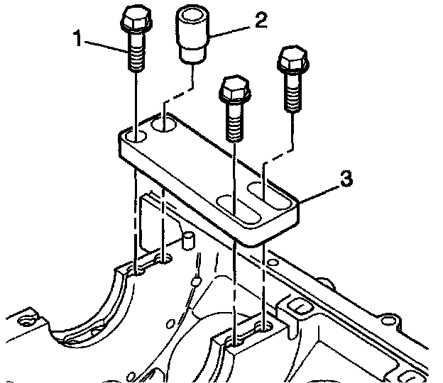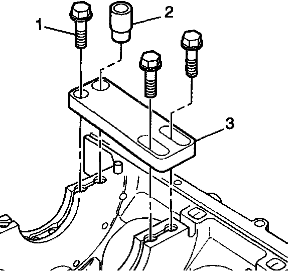 1. Position the fixture plate (3) with the bushing (2), installed over the crankshaft main cap bolt hole to be repaired.