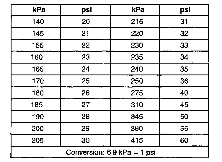 Inflation Pressure Conversion (Kilopascals to PSI)