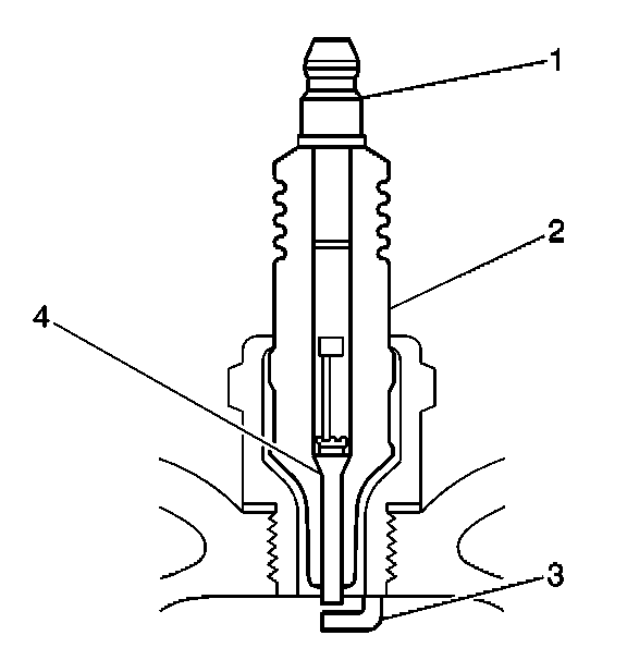 - Measure the gap between the center electrode (4) and the side electrode (3) terminals. Refer to Ignition System Specifications. An excessively wide electrode gap can prevent correct spark plug operation.