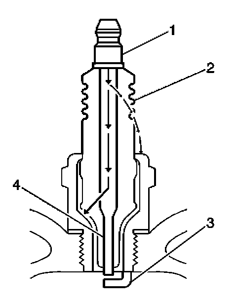 - Inspect for signs of tracking that occurred near the insulator tip instead of the center electrode (4).