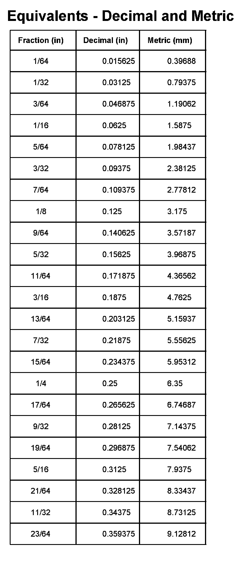 Equivalents - Decimal And Metric