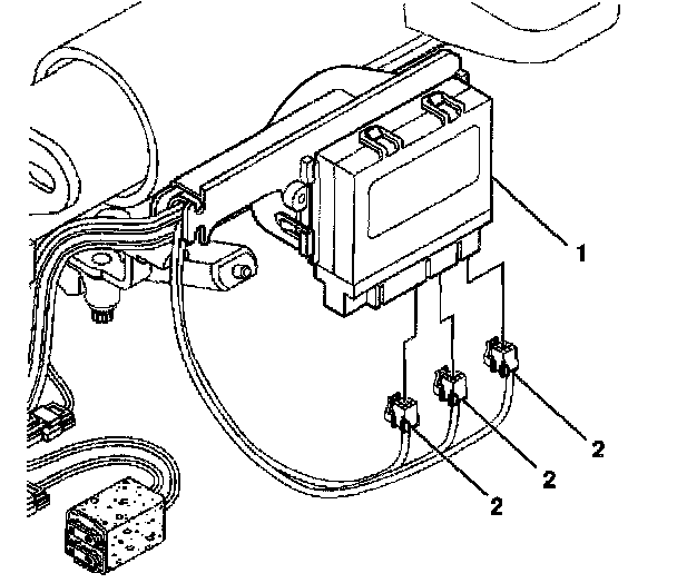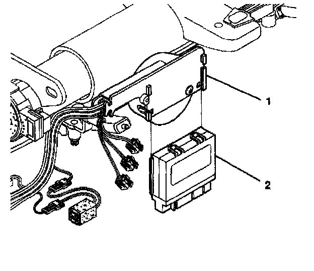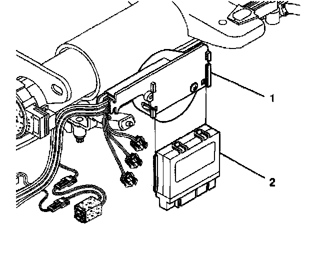 4. Remove the control module (2) from the wire harness shield (1) of the lower steering column by pulling the module outward to release the retaining clips and sliding the module downward.