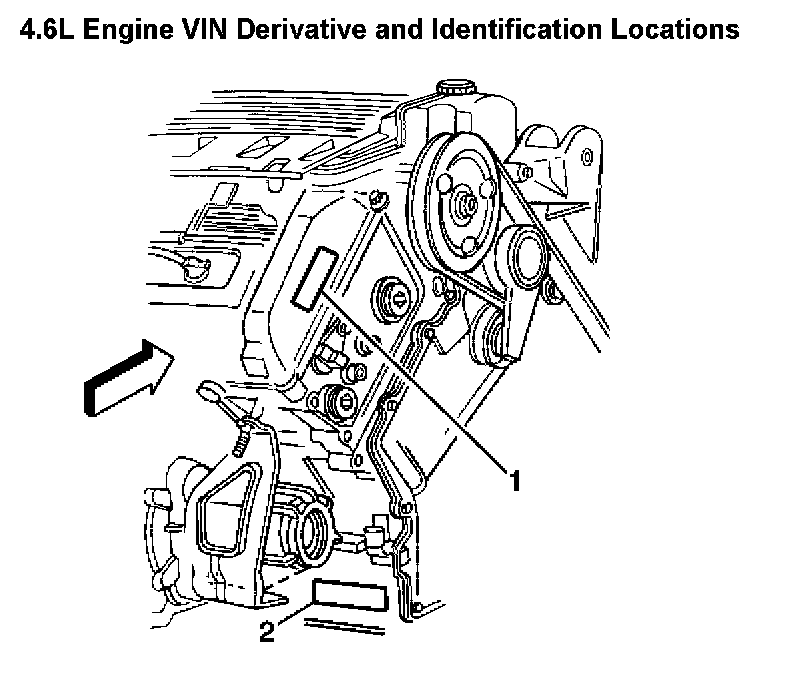 The engine ID number will be located on the front of RH rocker cover or the RH side of oil pan rail (1), and the VIN derivative is located on the engine block in front of the transaxle extension (2).