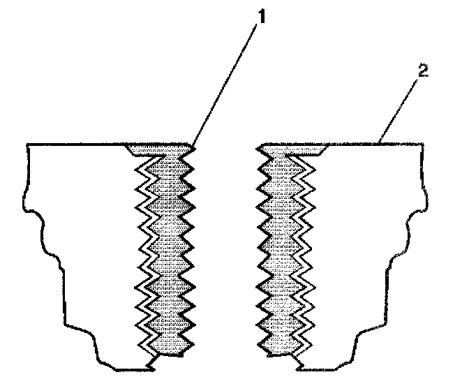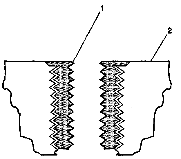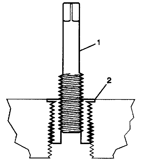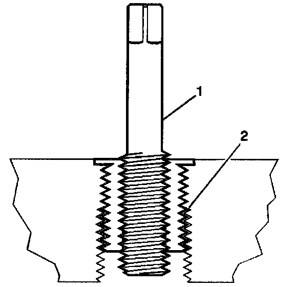 15. Inspect the insert for proper installation into the tapped hole. A properly installed insert (1) will be either flush or slightly below flush with the surface of the base material (2).