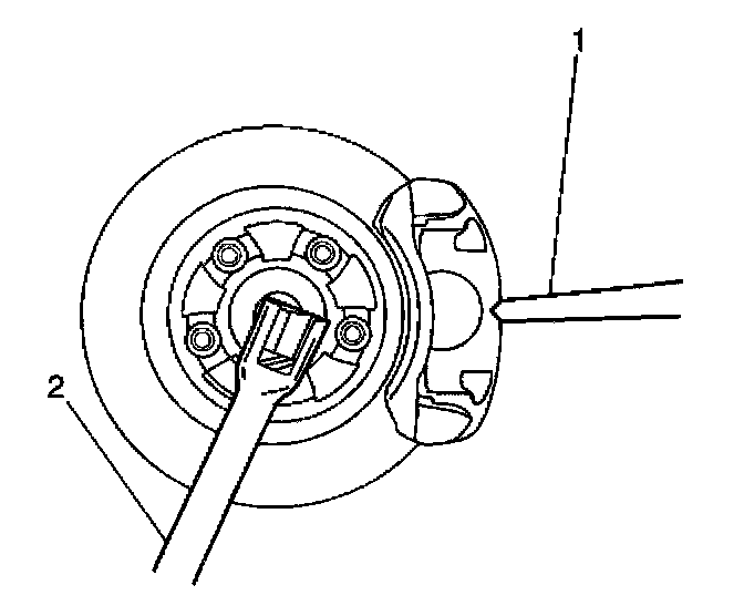 7. Insert a drift punch (1) or screwdriver into the caliper and rotor to prevent the rotor from fuming.