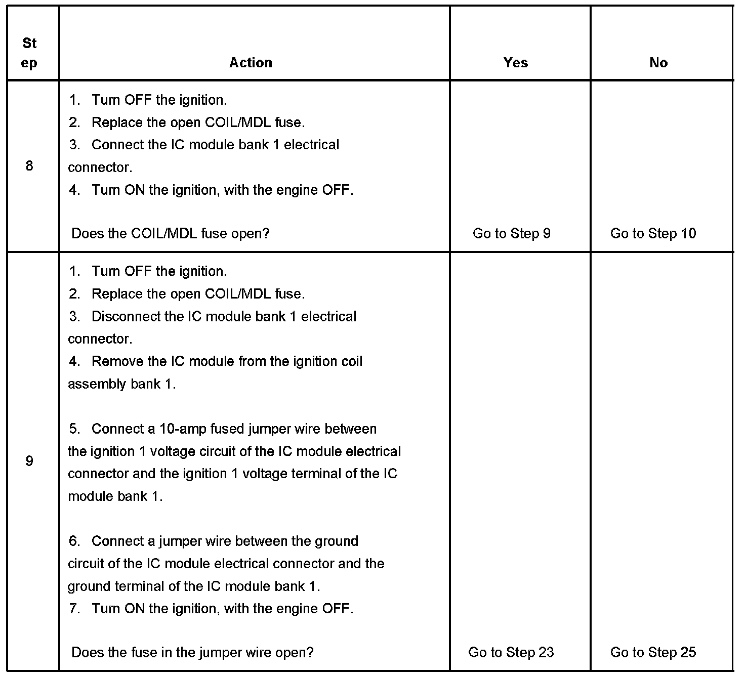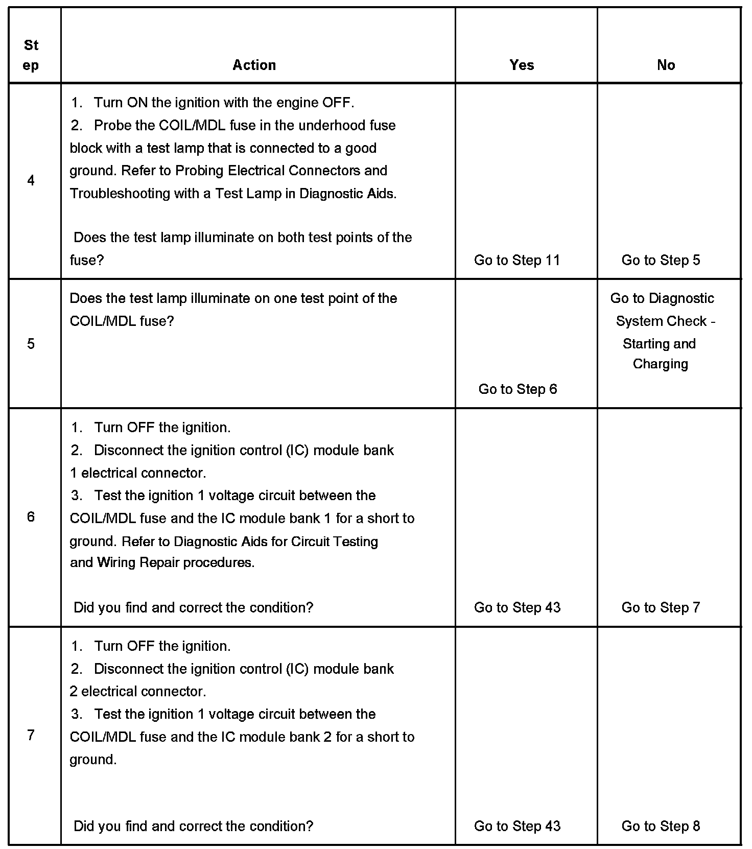 3. This step tests for a short to battery positive voltage on the ignition 1 voltage circuit. When the ignition is turned OFF, the test lamp should not illuminate at the COIL/MDL fuse.