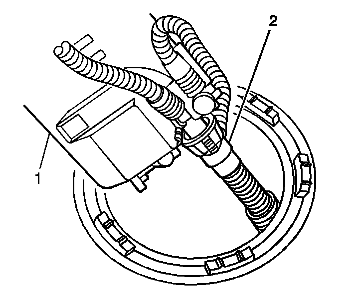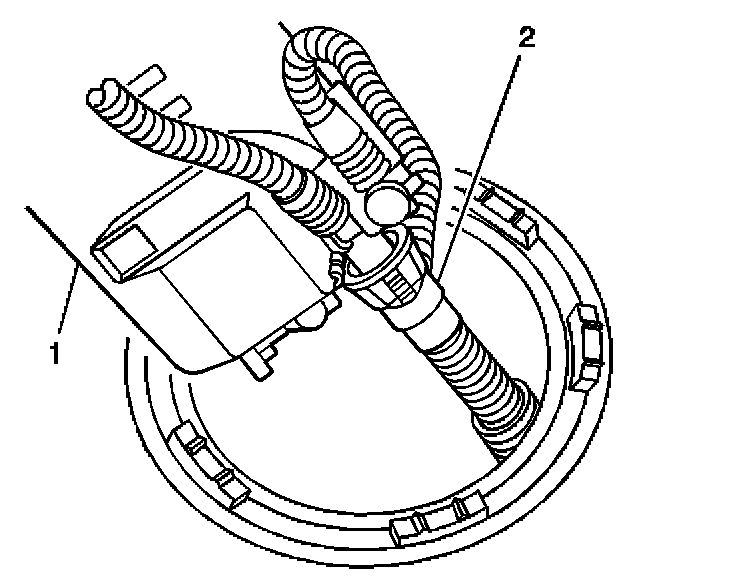 5. Carefully lift the primary fuel tank module (1) from the fuel tank only enough to access the transfer tube (2).