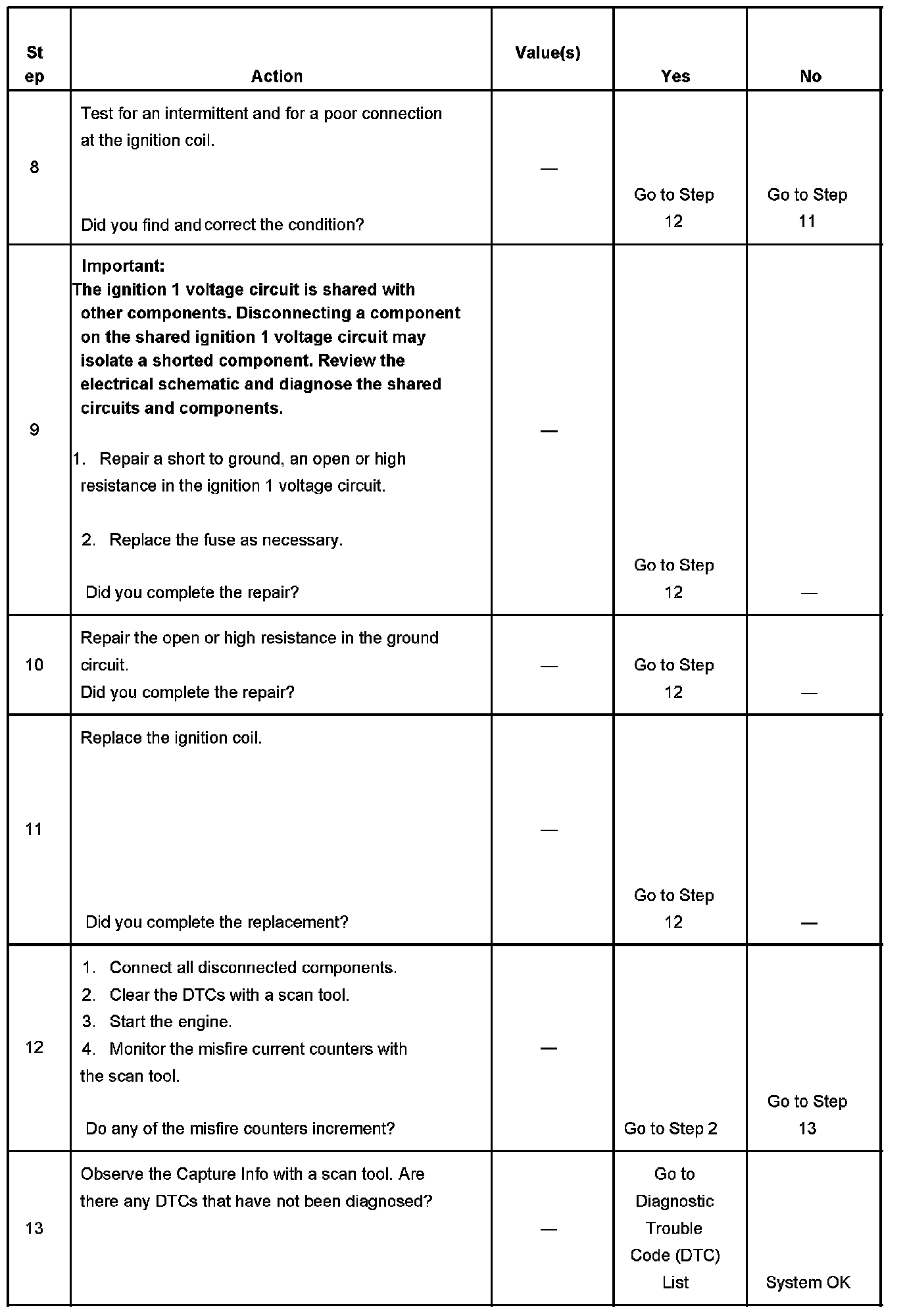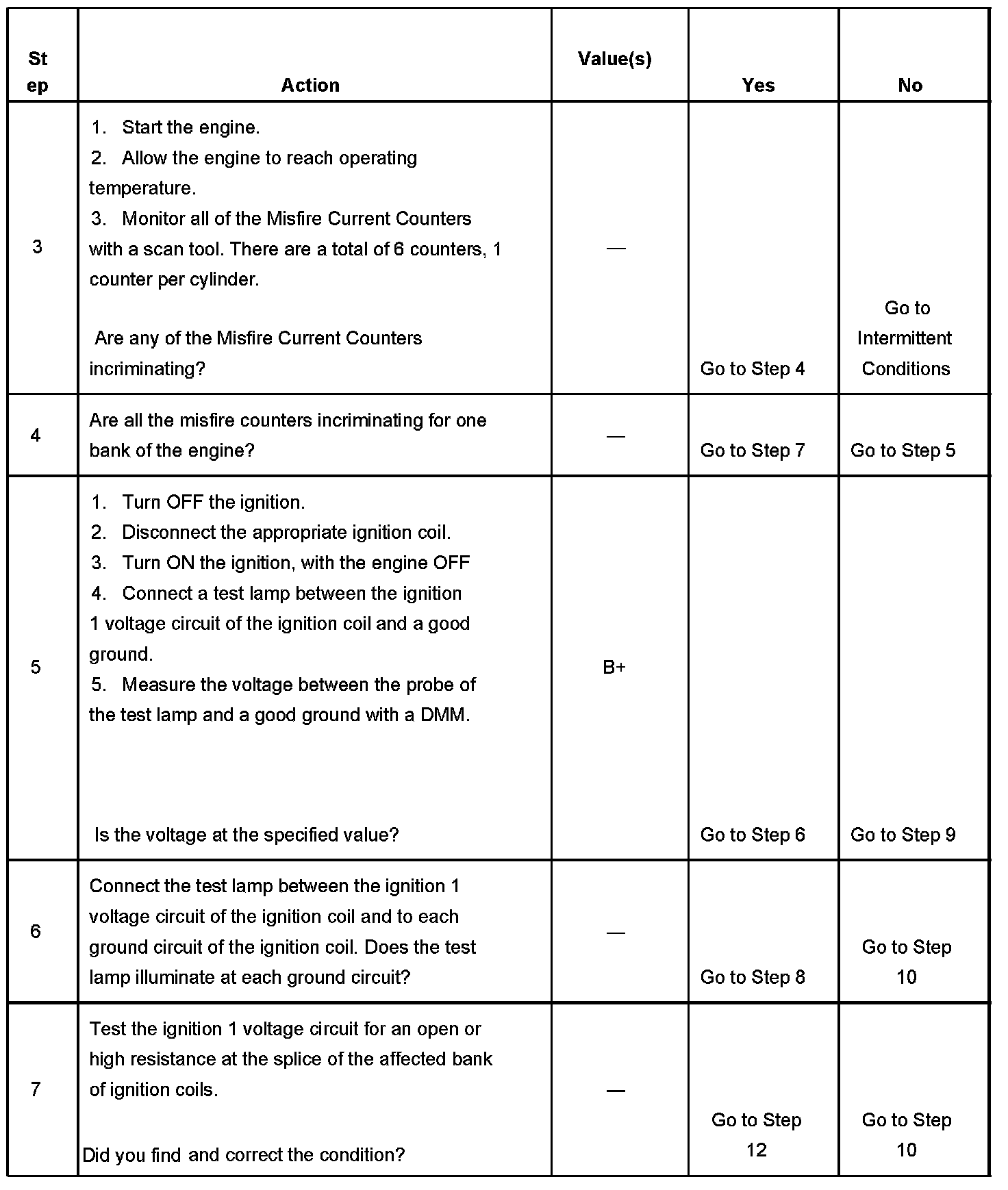6. This step determines if the ground circuit is open. If the circuit is open, the ignition coils would be inoperative for one bank of the engine.