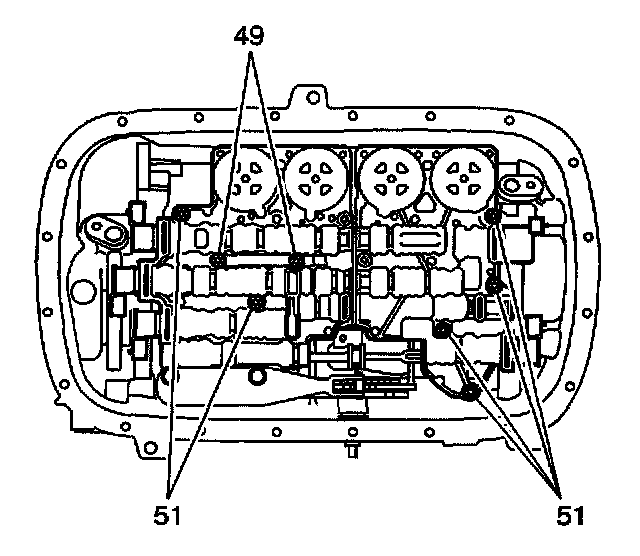 7. Tighten the control valve body accumulator bolts (49, 50, 51) in sequence.