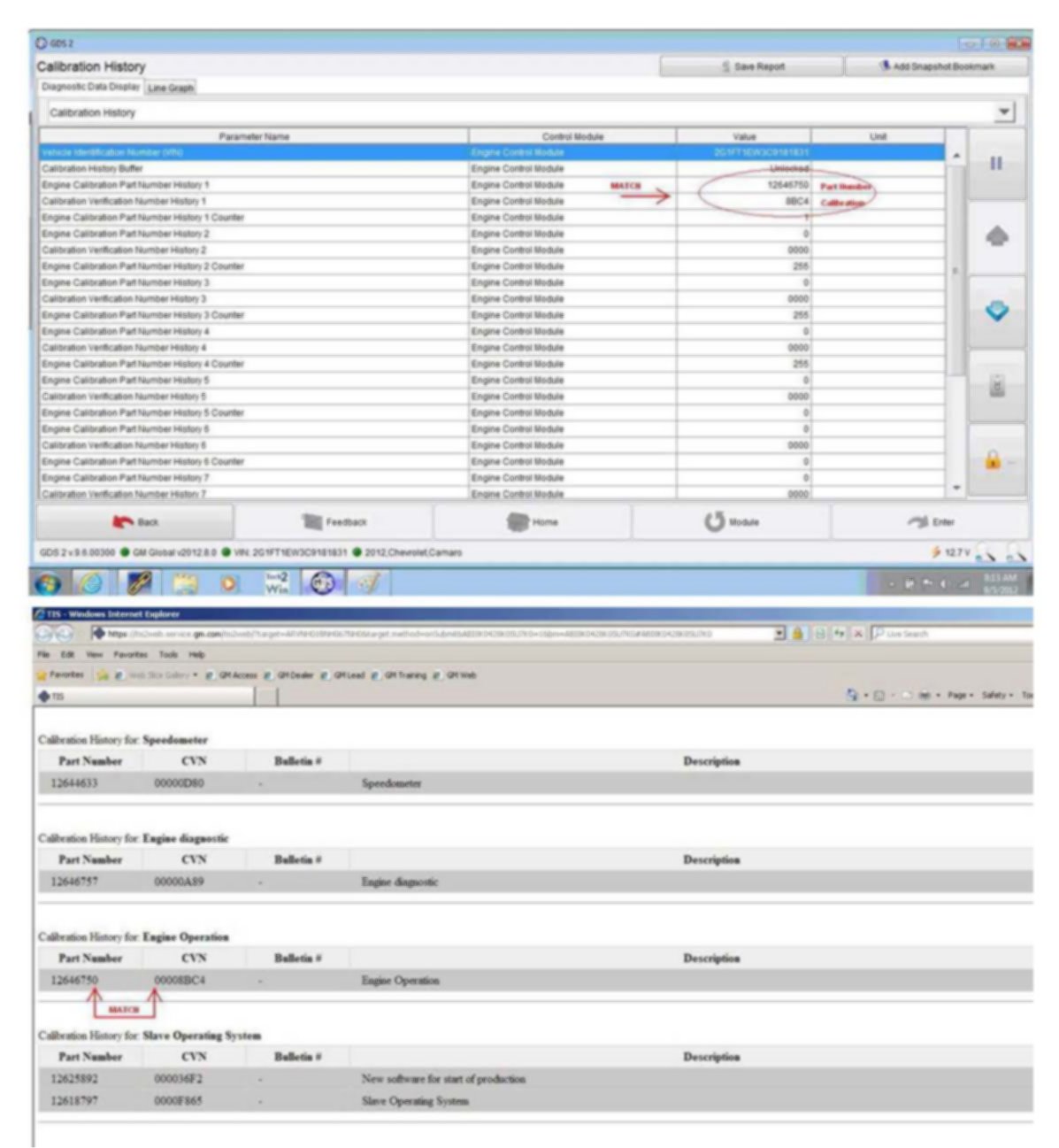 Compare each: Engine Calibration Part Number History parameter and Calibration Verification Number History parameter from the GDS 2 Calibration History screen to the Calibration Part Number and Calibration Verification Number (CVN) listed in the GM Vehicle Calibration Information screen of TIS2WEB to ensure that they are ALL an EXACT MATCH.