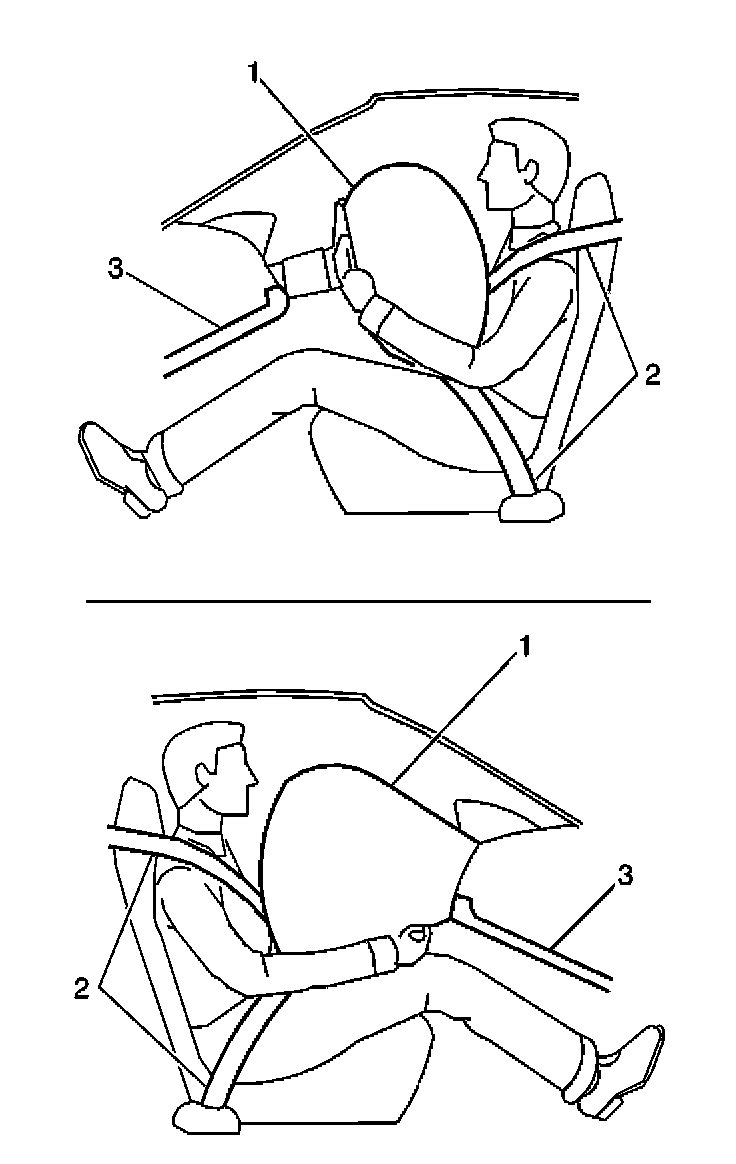 SIR SYSTEM OVERVIEWThe supplemental inflatable restraint (SIR) system supplements the protection offered by the occupant's seat belt system (2). The SIR system may contain several inflator modules located throughout the vehicle, i.e. steering wheel module (1), instrument panel (I/P) module (1), or side impact modules. In addition to inflator modules, the vehicle may contain seat belt pretensioners that tighten the seat belt in the event of a collision, thus reducing the distance between the occupant and the seat belt when an inflator module is deployed. Each inflator module has a deployment loop that is controlled by the sensing and diagnostic module (SDM) mounted inside the vehicle. The SDM determines the severity of a collision with the assistance of various sensor inputs located at strategic points on the vehicle. When the SDM detects a collision of sufficient force it will process the information provided by the sensors to further support air bag deployment. The SDM performs continuous diagnostic monitoring of the SIR system electrical components. Upon detection of a circuit malfunction, the SDM will set a DTC and inform the driver by turning the AIR BAG indicator ON. The steering column (1) and knee bolsters (3) are designed to absorb energy and compress during frontal collisions in order to limit leg movement and decrease the chance of injury to the driver and passenger. After an Air Bag deployment, the SDM will send out a post-air message to the Rear Integration Module (RIM). The RIM will unlock the doors and turn ON the interior lights 15 seconds after receipt of this message.
