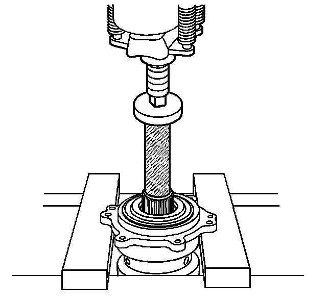 4. Remove the pinion shaft and bearing from the cage using the J45006 and a hydraulic press.