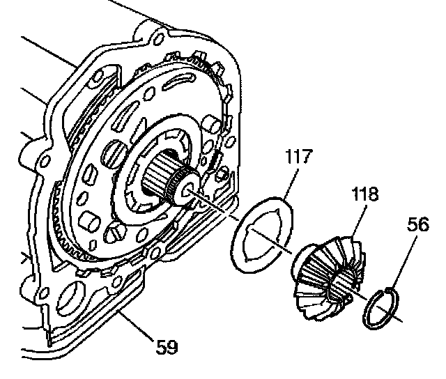 5. Remove the left side differential gear (118). Remove the thrust washer (117).