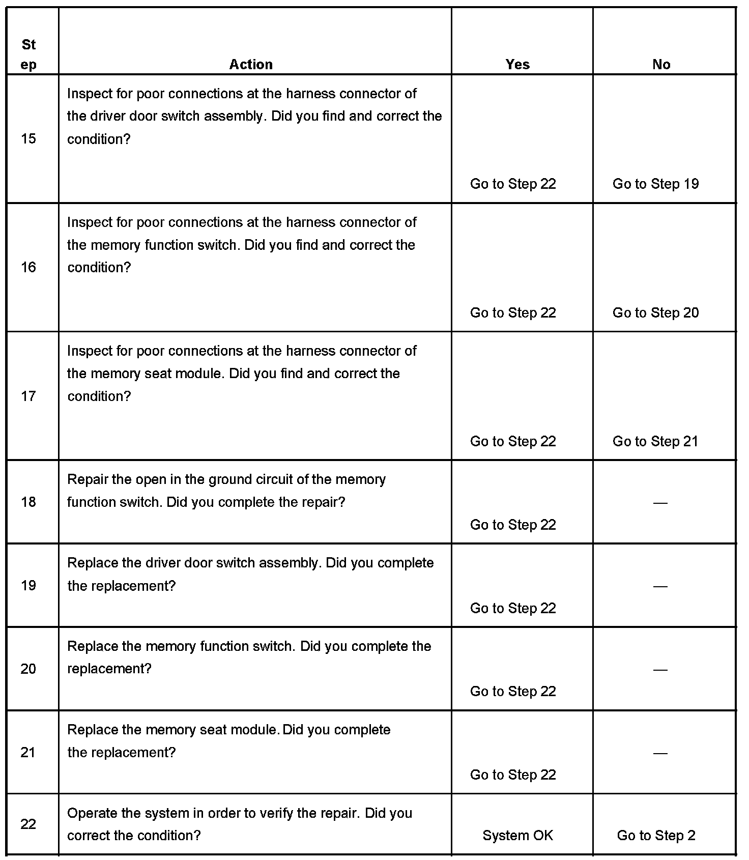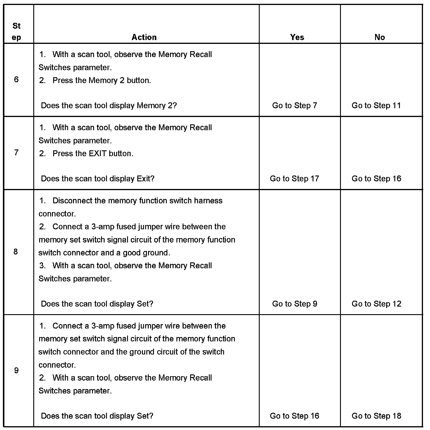 10. This step tests the integrity of the memory 1 switch signal circuit of the driver door switch assembly. If the fuse in the jumper wire opens when you perform this test, a short to battery voltage may have occurred.