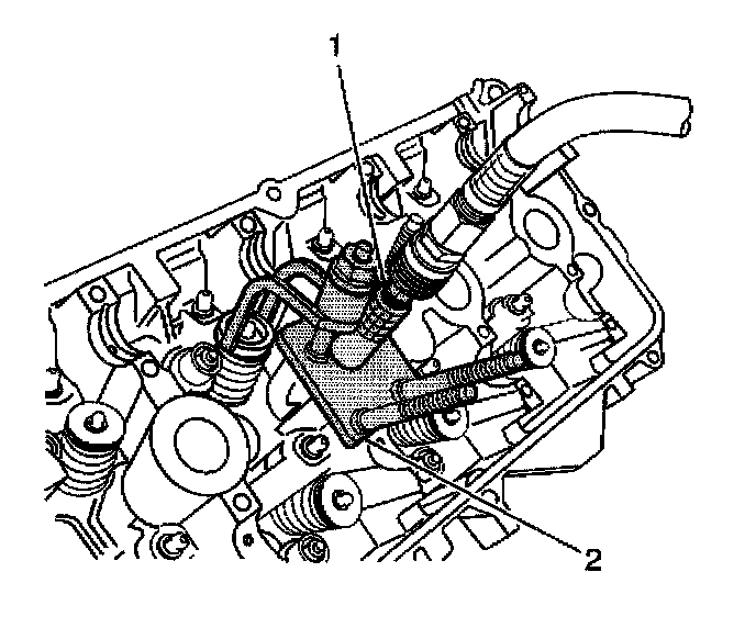 11. Install the arm and swivel nut of the J 44211 (2) over the stud corresponding to the valve to be serviced.