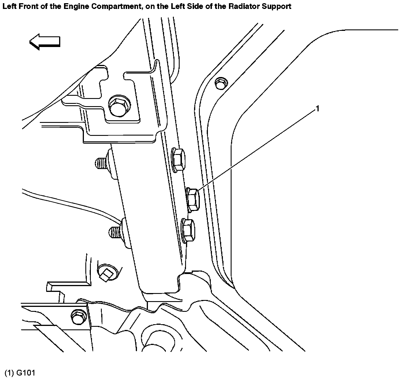 Left Front Of Engine Compartment, Left Of The Radiator Support