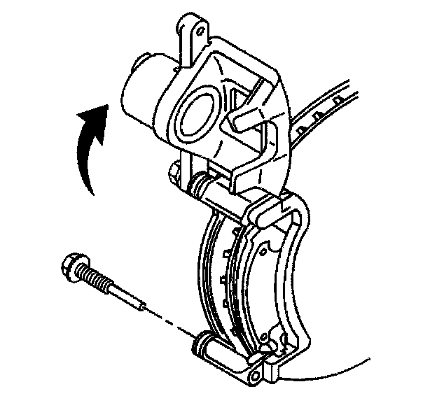 11. Pivot the brake caliper body upward and secure out of the way with heavy mechanic's wire or equivalent. Do NOT disconnect the hydraulic brake flexible hose from the caliper.