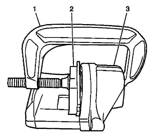 12. Install a large C-clamp (1) over the body of the brake caliper (3) with the C-clamp ends against the rear of the caliper body (3) and against an old inner brake pad or a wood block (2) installed against the caliper piston.