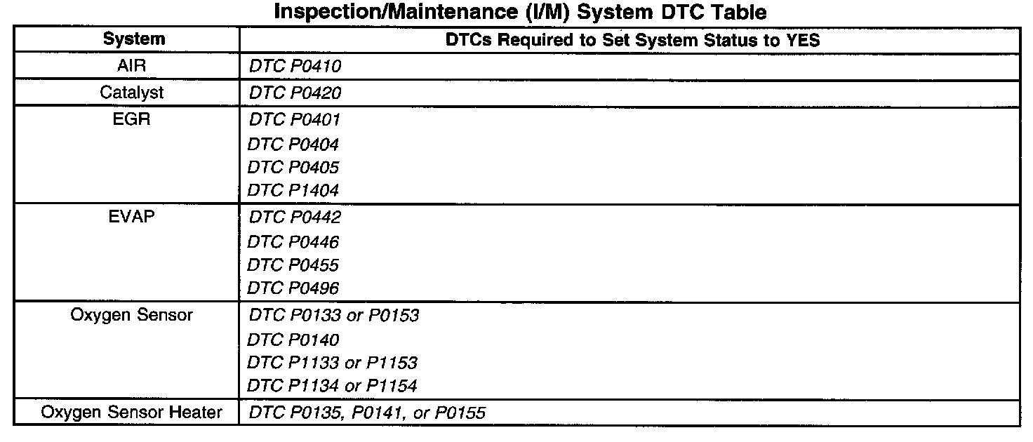 Inspection/Maitenance (I/M) System (DTC) Table