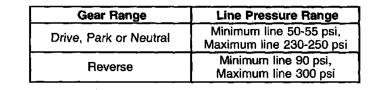 Line pressures are calibrated for two sets of gear ranges-Drive-Park-Neutral, and Reverse. This allows the transmission line pressure to be appropriate for different pressure needs in different gear ranges: Gear Range Line Pressure Range Minimum 50-55 psi, Drive, Park or Neutral Maximum late 230-250 psi Minimum line 90 psi, Reverse Maximum line 300 psi.