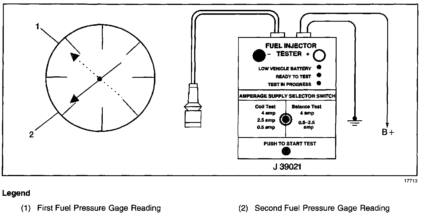 Calculate the pressure drop value for each fuel injector by subtracting the second pressure reading from the first pressure reading. Refer to the illustration.